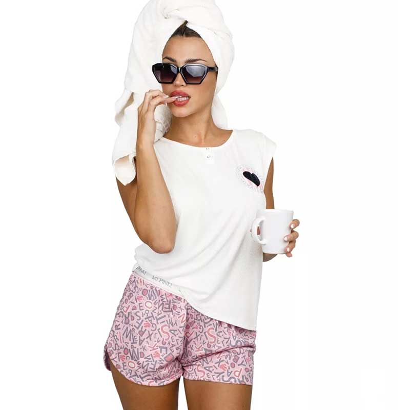 Remera de Morley con detalle de brochecitos y corazón con glitter / Boxer de viscosa estampado con detalle de elástico ancho.